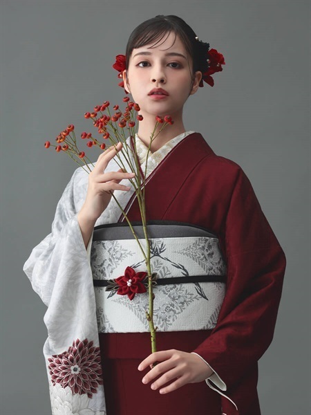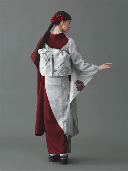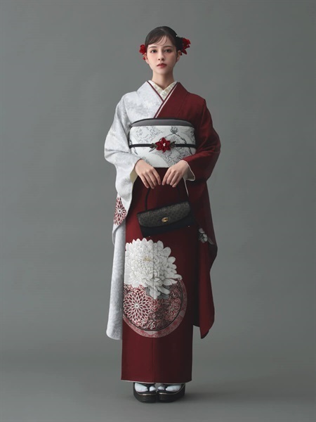 F5715 ボルドー色×祝い菊柄の正絹振袖単品